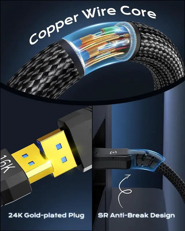 Quality ImprovementUpgraded and thickened copper wire core, 24k gold-plated plug, and multiple shielding such as aluminum foil, ground wire, and Al-MgWire Mesh. Double anti-interference and more stable transmission. Nylon Braided makes the cable more strong