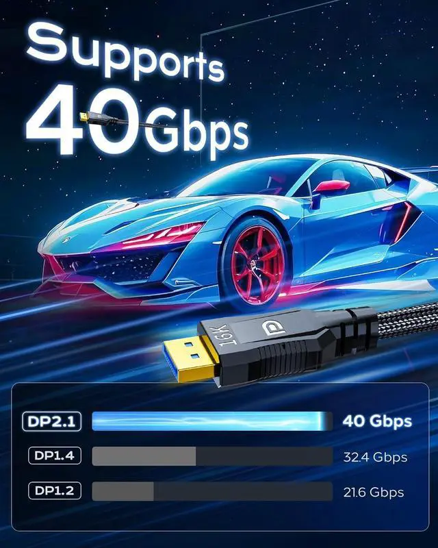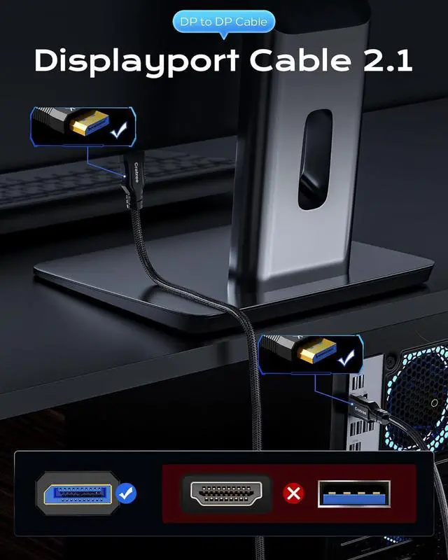 VESA CertifiedA VESA Certified Cratree DisplayPort to DisplayPort 2.1 Cable 6.6 Feet.Supports advanced technologies such as G-SYNC and FreeSync, FEC, DSC, etc., compatible with performance graphics cards to prevent tearing and ghosting caused by rapid screen transitions during gaming, making the game more stable.Downward compatible with display ports cable 2.0/1.4/1.2