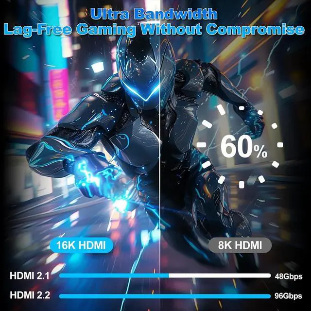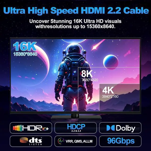 16K/8K HDMI 2.2 Cable Ultra HD Performance: With our hdmi 2.2 cable, delivering ultra-fast 96 Gbps bandwidth for stunning resolutions up to 16K@60Hz, 12K/10K@120Hz, 8K@120Hz/240Hz/60Hz, 4K@240Hz/360Hz/480Hz. Perfect for future-proofing your home theater and gaming setup, this high speed hdmi cable ensures seamless compatibility with all HDMI devices, supporting next-gen gaming and 12-bit HDR content for unparalleled clarity.