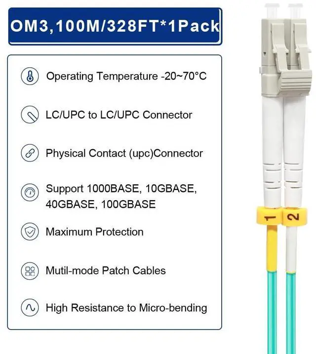 The 100M (328ft) OM3 LC-LC Fiber Optic Patch Cable is designed for high-density applications in gigabit Ethernet, fiber channel, local area networks, data centers, and more. It is ideal for connecting 10G SR, 10G LRM, SFP+ transceivers, and other devices for 10G/40G/100G Ethernet connections. OM3 is the preferred fiber specification for 10G Ethernet connections.