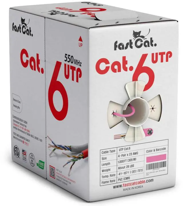 fast Cat. Cat6 Ethernet Cable 1000ft - 23 AWG, CMR, Insulated Solid Bare Copper Wire Cat 6 Cable with Noise Reducing Cross Separator - 550MHZ / 10 Gigabit Speed UTP LAN Cat6 Cable 1000ft - CMR (Pink)