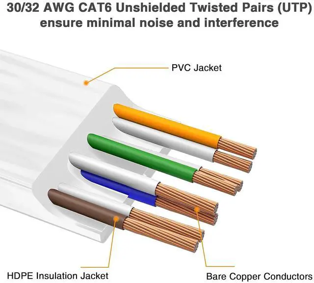 100% Bare Copper and 50 Micron Gold Plated: 32AWG OFC(Oxygen free copper) and 24K gold plated RJ45 plugs make the transmission efficiency up to 100%, plus sheath material PVC and insulation material HDPE, we can enjoy faster and safe speed networking