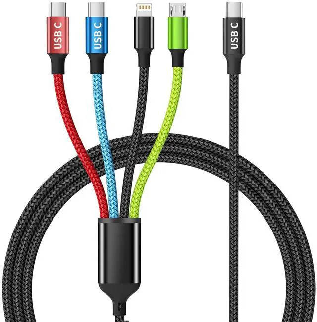 [4 in 1 Charging Cable] Multi chargers for all devices with different ports using our universal 4 in 1 charging cable. It supports iPhone, USB-C, Micro USB, and more, eliminating the need for multiple charging cables. (Dual Type-C Port. Only iOS Connector Support Data Sync, 480Mbps)
