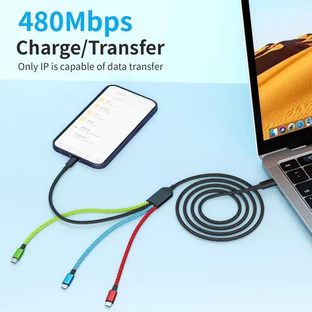 [Fast Charging Cords] This USB C multi cable 4 in 1 charging cable delivers stable voltage and current protection, ensuring your devices are charged safely at maximum speed. Plus, the iPhone charger cord also supports data transmission, with speeds up to 480 Mbps, allowing you to transfer files in seconds.(Only iOS Connector Support Data Sync, 480Mbps)