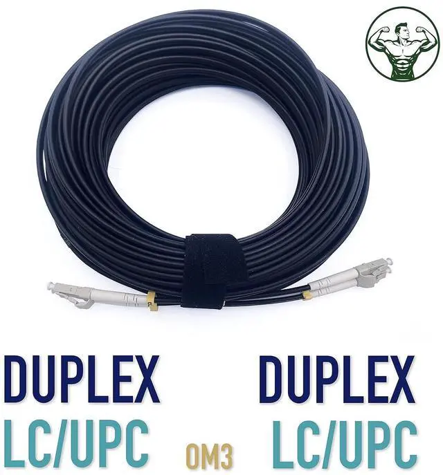 Armored steel fiber optic cable for outdoor and indoor LC/UPC to LC/UPC OM3 multimode duplex, 50/125 um. Shielded steel tape inside the outer jacket resists damage caused by harsh environments, stress, and rodent bites. High-quality fiber ensures reliable connections in harsh environments (machinery, factories, railroads, churches, etc.).