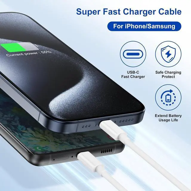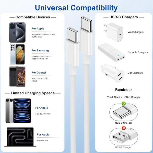 PERFECT COMPATIBILITYThis is the USB-C to USB-C cable Not the USB-C to USB-A cable, Compatible with iPhone 15/15 Pro/15 Pro/ Samsung Galaxy S23/S22/S21+/S21/S20/ S20+/ S20 Ultra/ Note 10, MacBook Air/Pro 13'', iPad Mini 6, iPad Pro 2021/2020/2018, iPad Air 2020 and more.