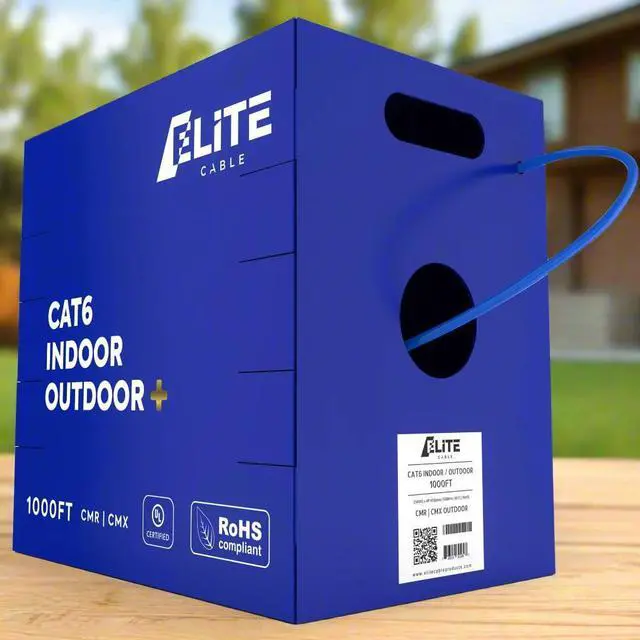 Elite Cat6 Indoor/Outdoor Ethernet Cable | Run cable indoors and outdoors with Cat6 performance. Coming in an easy to pull box this 1000ft cable is perfect for in walls, room to room, network rooms, warehouses, outdoor cameras, access points, residential networks, gaming, riser runs, you name it this cable can do it.