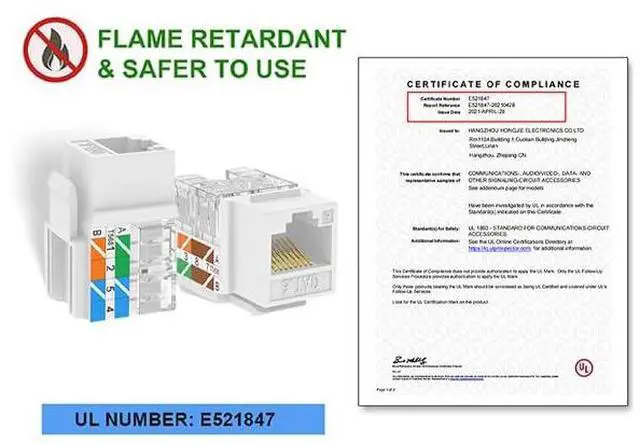 Package Content: 50 x Cat6 90-degree keystone jack + 1 x keystone punch down stand tool + 1 x mini wire stripper cutter. With UL Listed Connector, just use it without concern.