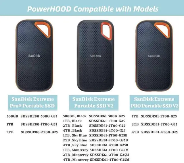 [Compatible with]: SanDisk Extreme Pro Portable SSD: SDSSDE80-500G-G25 SDSSDE80-1T00-G25 SDSSDE80-2T00-G25 500GB 1TB 2TB/ Extreme Portable SSD V2: SDSSDE61-500G-G25 SDSSDE61-1T00-G25 SDSSDE61-1T00-G25B SDSSDE61-1T00-G25M SDSSDE61-2T00-G25 SDSSDE61-2T00-G25B SDSSDE61-2T00-G25M SDSSDE61-4T00-G25 SDSSDE61-4T00-G25B SDSSDE61-4T00-G25M/ Extreme PRO Portable SSD V2: SDSSDE81-1T00-G25 SDSSDE81-2T00-G25 SDSSDE81-4T00-G25 1TB 2TB 4TB Project Hard Drive