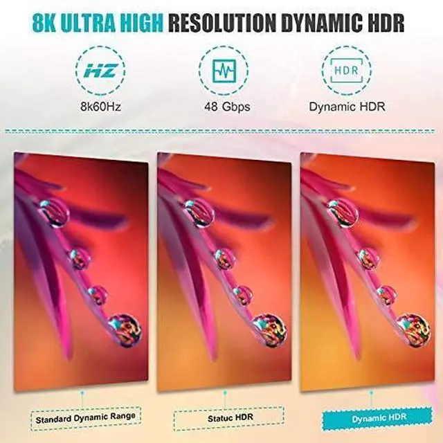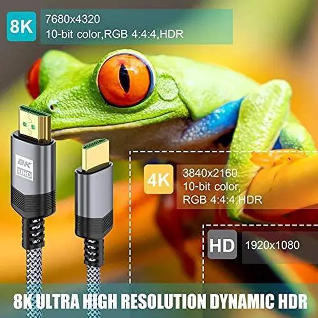 8K@60Hz HDMI 2.1 CableHDMI 2.1 version is the latest update of the HDMI standard and 4:4:4 chroma which supports a range of higher video resolutions and refresh rates,including 8K@60 Hz (7680x4320) and 4K@120Hz (3840x2160) and resolutions up to 10K,Step into the next era of picture quality.