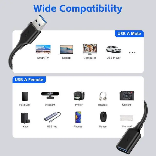 Universal Compatibility: You can use the USB 3.0 cable to extend the distance between your device and your computer or charging outletas, such as smartphone, usb flash drives, hard drives, PS4 controllers, card readers, Bluetooth adapters, keyboards, mice, webcams, GamePad, Playstation, Xbox, VR Headset, hub, printer, scanner, camera. Easily provide data transfer and charging for your devices