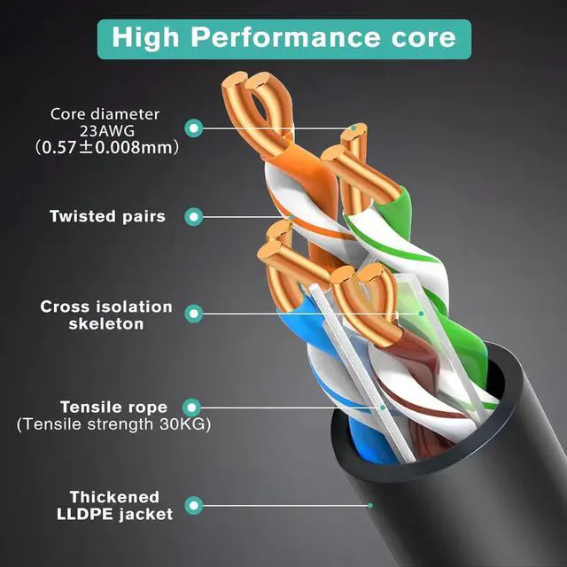 Thicker wire cores: This Cat6 Network cable is made of 4 pairs of 23AWG single stranded CCA core, which enables faster and more stable network speed compared to multi-stranded cores. In addition, separated by cross isolation splines to effectively reduce EMI/RFI interference.