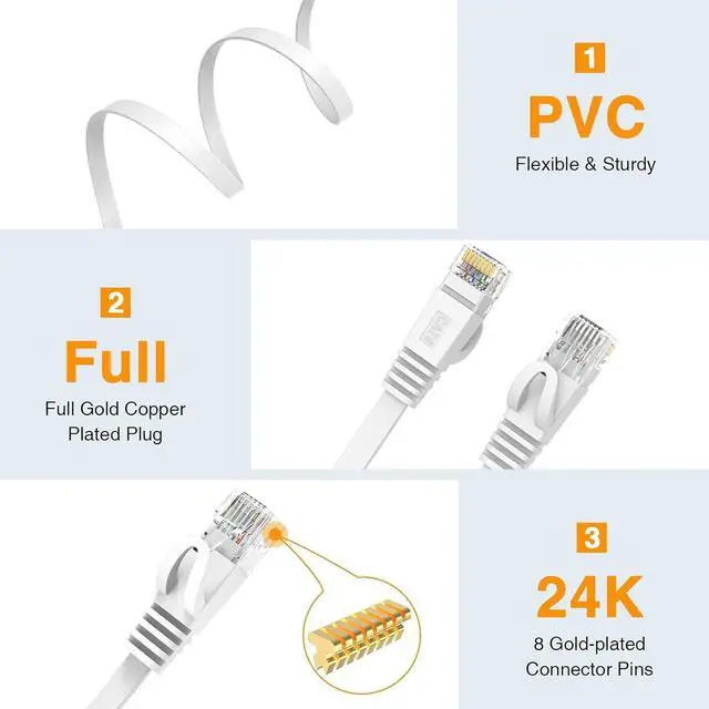 100% Bare Copper and 50 Micron Gold Plated: 32AWG OFC(Oxygen free copper) and 24K gold plated RJ45 plugs make the transmission efficiency up to 100%, plus sheath material PVC and insulation material HDPE, we can enjoy faster and safe speed networking