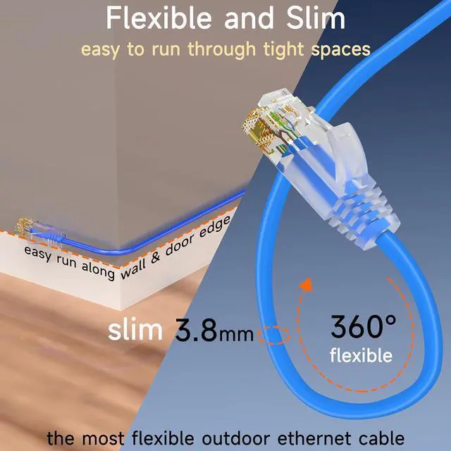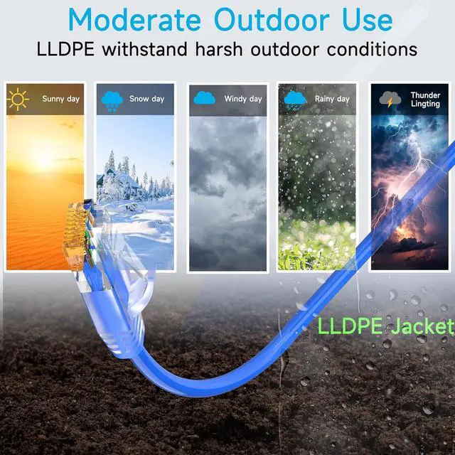 Moderate Outdoor Use : The waterproof cables enable cat6 ethernet cable to withstand harsh outdoor conditions. The sturdy LLDPE outer sheath of cat 6 outdoor ethernet cable is weather resistant, highly resistant to rain, snow, and harsh sunlight, ensuring stable connection under all conditions.