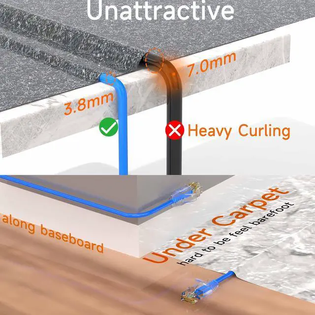 Unattractive: The thin design makes cat 6 ethernet cable 150 ft very easy to run along walls and carpets, and then up walls along door frames. It's so thin, almost gone, unless you really want to find cat 6a ethernet cable 150 ft, you can't even feel it barefoot.
