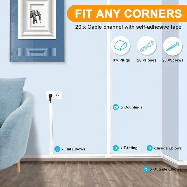 BOX CONTENT: 20× cable channel with self adhesive tape (15.75"L×0.98"W×0.63"H of each channel, total 315"), 20×couplings, 3×T-Fitting, 3 × flat elbows, 3× inside elbows, 3×outside elbows, 3× plugs, 20× screws, 20× hoses. 1pcs cable raceway can fit around 3-4 cables