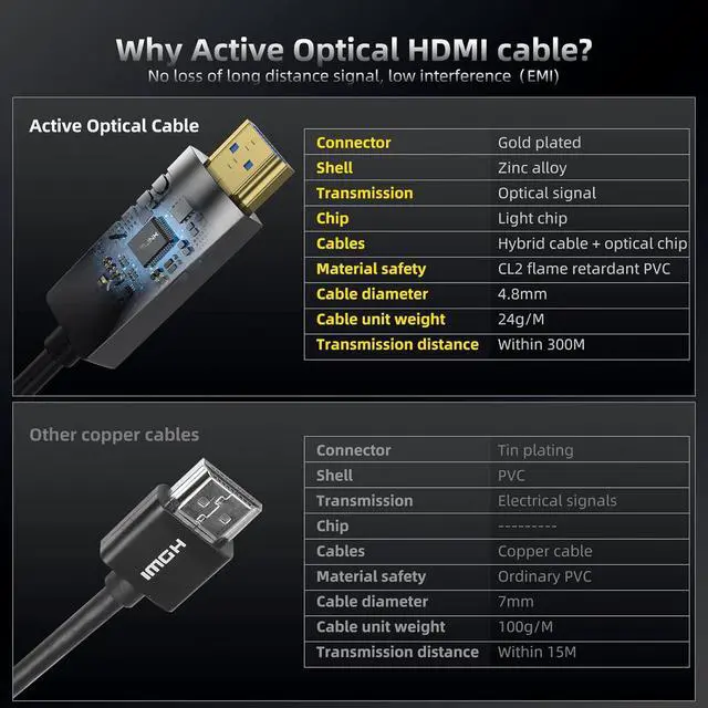 Easy InstallationOuter diameter is 0.189 inch (4.8mm). Much thinner, lighter than copper Hdmi Cable. No external power needed. Easy for in wall installation. 24K gold-plated connectors, minimize interference, no black screen, ensure image quality and sound, signal loss and digital timing errors.