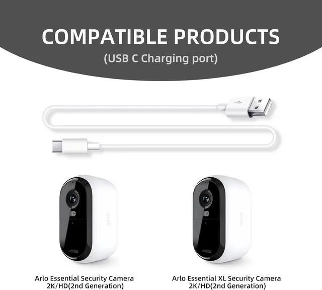 Long enough charging cable: With a 10-foot charging cable provides reliable power to your Arlo Essential 2K (2nd Gen), ensuring uninterrupted operation, your device can be charged at any time. It is convenient to use and does not require frequent battery replacement