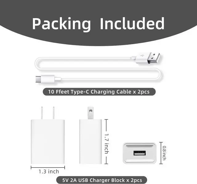 Package Included: 5V 2A USB A charger block x 2, USB A to USB C charging cable x 2