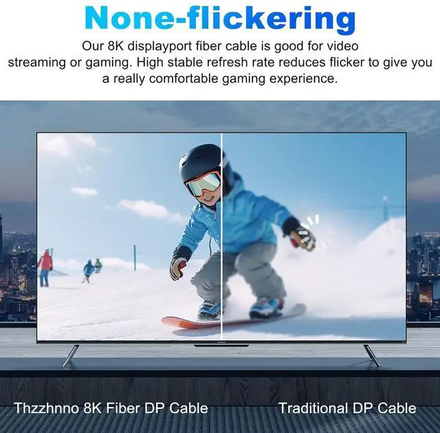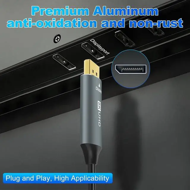 Fiber Optic DisplayPort Cable 8KThis DisplayPort 1.4 is an optical fiber version. Compared with copper cable on the market, fiber optics can transmit over long distances without loss. It is also resistant to electromagnetic interference, so you no longer have to worry about blur, distortion, and delay. Stable, smooth, and high-speed data transmission makes you win the game. It is fully compatible with FreeSync and G-Sync.