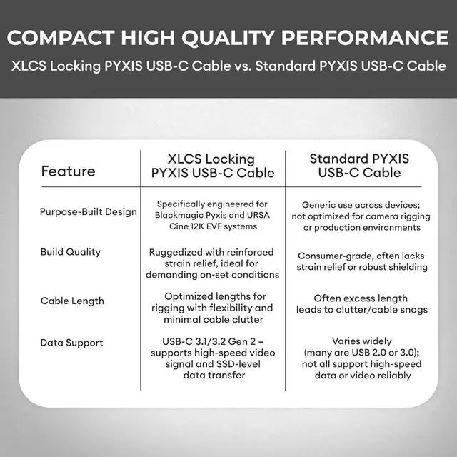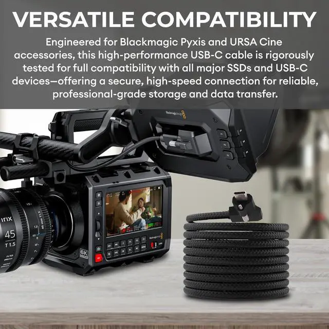Universal Compatibility Thoroughly tested for dependability, this cable is compatible with leading SSDs and other USB-C peripherals. It is also a high-quality replacement for OEM cables on Blackmagic Pyxis & URSA Cine cameras.