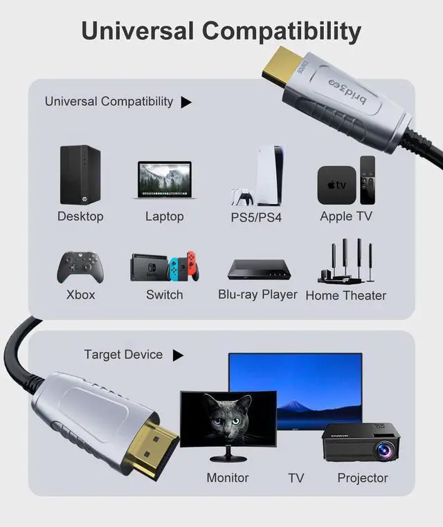 3 Universal Compatibility & Backward Support This fiber optic HDMI cable works with all HDMI-enabled devices, including PS5, Xbox Series X, RTX 4090/4080, RX7900 XTX,5090 5080 5070 GPUs, Apple TV, OLED/QLED TVs, projectors, and AV receivers. It is also fully backward compatible with HDMI 2.0/1.4, ensuring seamless performance across both new and older devices.