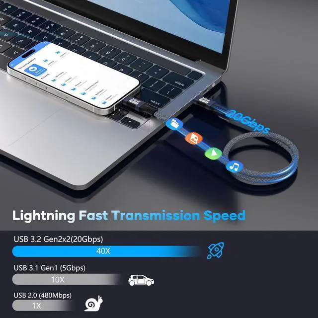 20Gbps Data Transfer:This USB C cable fully complies with USB C 3.2 Gen 2x2 specifications,supports up to 20Gbps high-speed data transfer,and is backward compatible with USB 3.1 and USB 3.0,the amazing transfer rate allows you to move 1GB of movies,files,documents or entire photo libraries in 3 seconds,this USB C cable is perfect for data transfer for iPhone 16/15 series,SSD,iPad Pro,MacBook