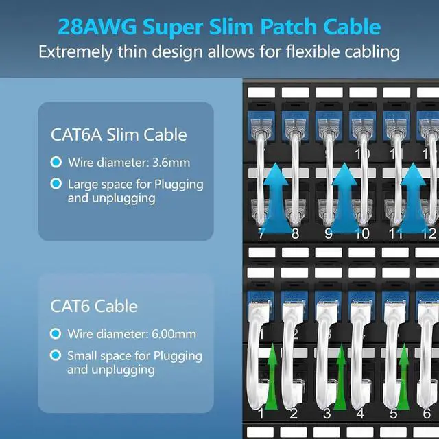 • Optimized for High-Density Installations: CableGeeker's 24-pack CAT6A 28AWG Ethernet cables deliver exceptional performance in data centers and server rooms. Over 50% thinner than standard CAT6, they save space and improve airflow, ensuring a clean and efficient network setu