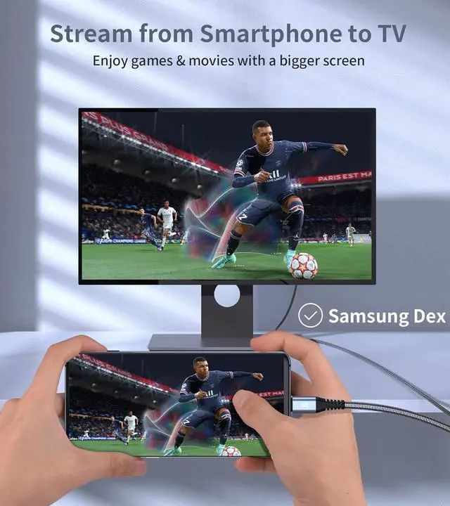 [Robust & Durable Design]: USB-C to HDMI cables use top chip technology, gold-plated connectors and durable nylon woven outer layer to provide maximum protection, prevent external signal interference and ensure the fast and stable transmission of high-definition digital audio and video signals. Each feature has been tested several times to ensure you get the best audio and video experience.*Note: It does not work in Xiaomi Mi A3, Redmi 11s, nor BlackView Tab 12, on Samsung and LG TV.