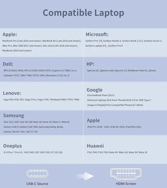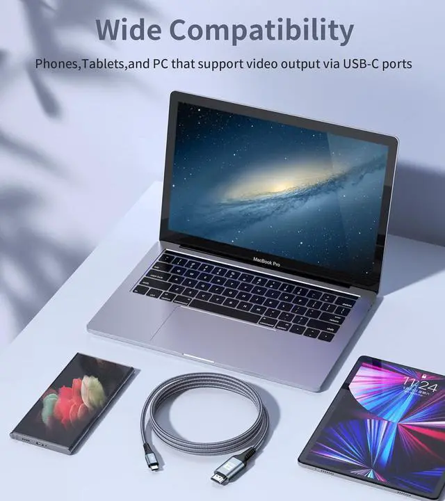 [Wide Applicability]: It is compatible with Laptops and Android Smartphones with USB-C Ports that Support DisplayPort Alternative Mode. Compatible with i Phone 17/16/15 Pro Max,Samsung S26 S25 S24 S23 S22 Plus/Ultra/FE,MacBook(2015 and later), MacBook Air 2018/2019, iPad Pro (2018 and later),iPad Air 4/5, Mac mini (2018 and later), iMac(2017 and later),Google Chromebook Pixel,Surface Book 3/2, Samsung S26/S25/S24/S23/S22/S21/S20,Galaxy Book, Z Flip, Dell XPS 15 and more.