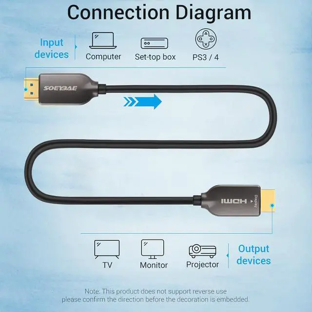 Universal Compatility: SOEYBAE Fiber HDMI Cable is compatible with earlier versions of HDMI (1.3/1.4/2.0/2.0a/2.1) and supports HDR, HDCP2.2, CEC, ARC, EDID, Chroma Subsampling YUV4:4:4/4:2:2/4:2:0.4K 60Hz 8bit for 4:4:4, 12bit for 4:2:2, 16bit for 4:2:0.Works with Blu-ray players, Fire TV, Apple TV, PS4, XBox One, computer, laptop, monitor, projector and more.