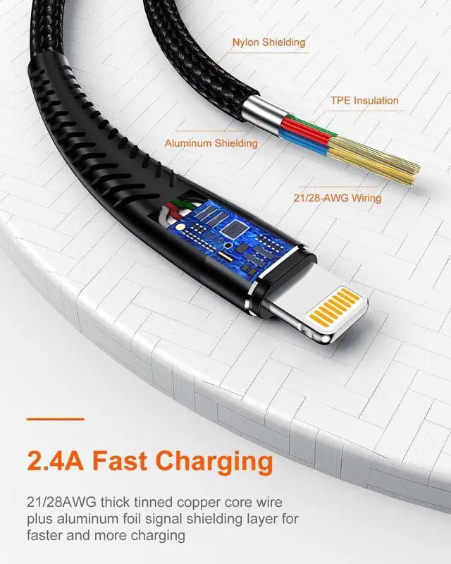 MFi Certified-Our Products Have Passed MFi Certification. We Use Nylon Environmentally Friendly Materials, And Designed A Total Of 122 Copper Wires, Which Are Divided Into 4 Wires As Cables To Ensure That The Charging Speed Of The Mobile Phone Reaches 2.7A And Stable Transmission. The Material Can Make The Cable More Wear-Resistant
