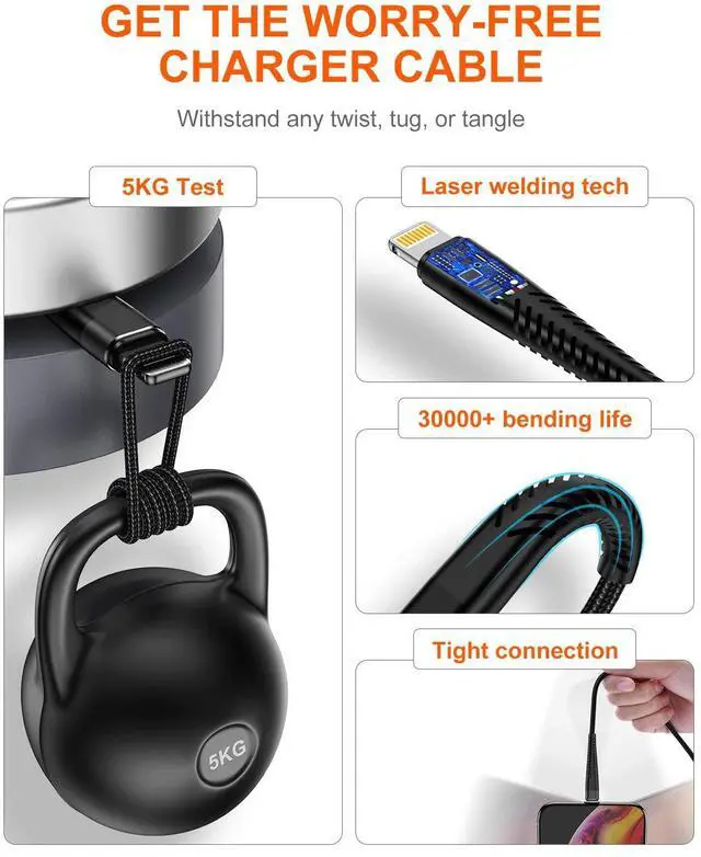 Durable And Flexible-More Than 30,000 Plug And Unplug Tests, And The Flexible Tpu in The Mobile Phone Charging Cable Can Extend The Life Of The Elbow. The Cable Uses High-Quality Nylon Materials To Make The Cable More Durable And Flexible. The Power Connection Of Each Device Is Made Of High-Quality Aluminum ( Prevent Breakage).