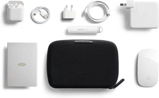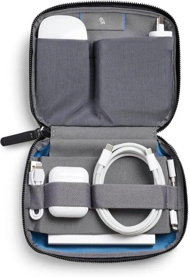 Slip pocket fits a slim power bank, stretch pockets store a mouse and charger, and elastic loops stow cables