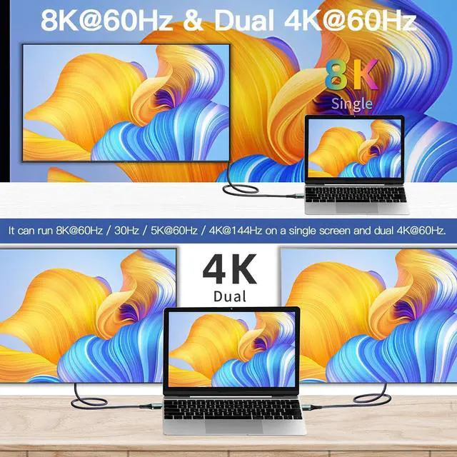8K@60Hz & Dual 4K 60HzThis 40Gbps for Thunderbolt 3 cable can run one 8K@60Hz/5K@60Hz/4K@144Hz display or dual 4K@60Hz displays. It is support daisy chain function, enjoying ultra HD video resolution. 40Gbps high speed USB C cables are suitable for eGPU and dual 4K UHD display scenarios. Note* Dual-monitor display requires 2 cables. *If you connect to USB C port for video output, please make sure your device supports DP Alt Mode. This setup can only comes one 4k display.