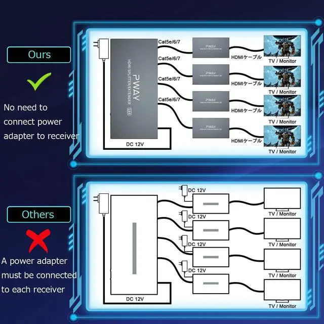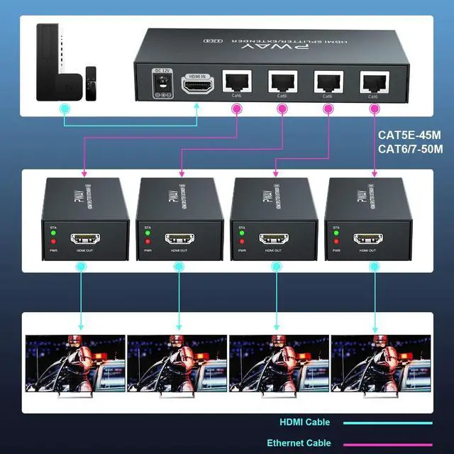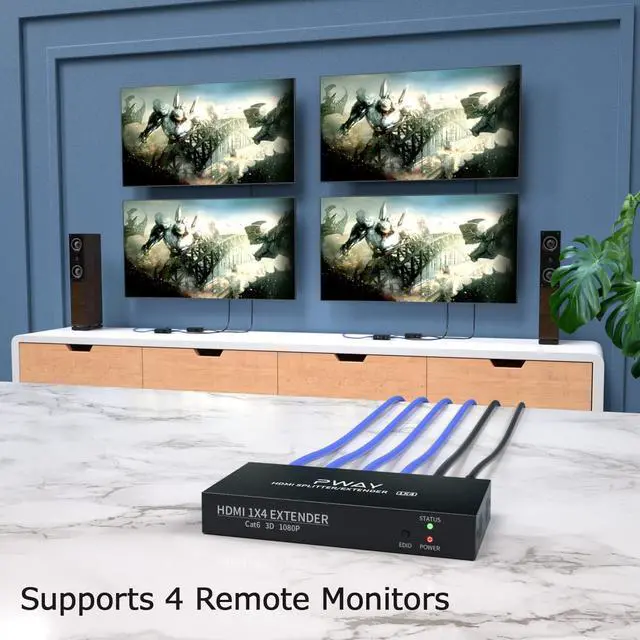 1 IIN 4 OUT:All the way to HD video source is divided into four by Cat6 transmission of 50 meters of high-definition video signal