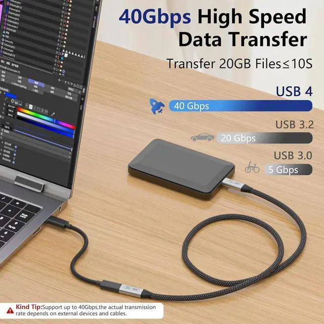 Upgraded 40Gbps High-Speed Data Transfer USB4.0 has a data transfer rate of up to 40Gbps. This USB4 cable can reach a data transfer rate of 40Gbps, and its transmission speed is twice as fast as that of Thunderbolt 3. However, it should be noted that only when both your data transmission equipment and the data itself support 40Gbps can this rate be achieved.