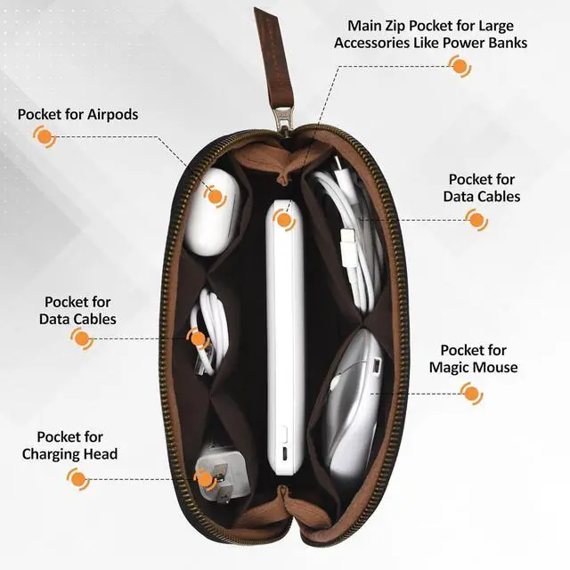 Nutuch leather cable organizer protects all your mini items, data cables, cables, USB, chargers, headphones, phone, mobile, power bank, passport, banknotes, cards and other electronic devices.