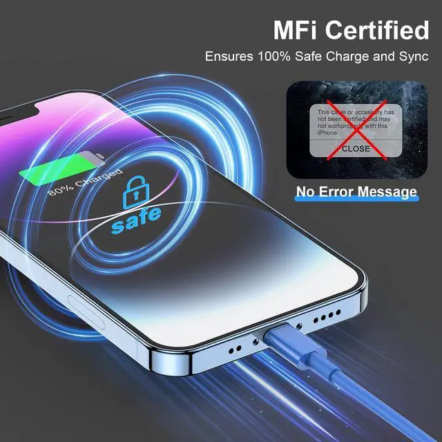 Apple MFi Certified Lightning Cable6 ft USB-C to Lightning Cable with MFi certification made for iPhone14. The latest C94 lightning connector to ensure that no warning messages pop up and is fast charging cord designed for iPhone14 pro.