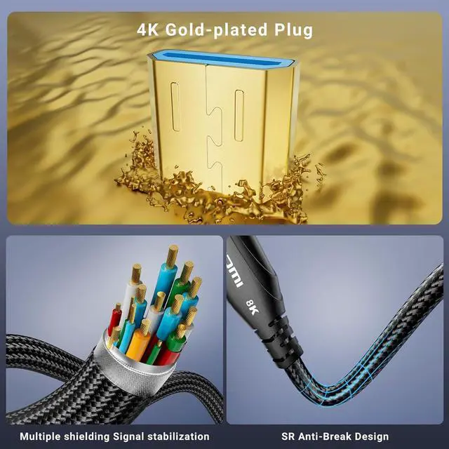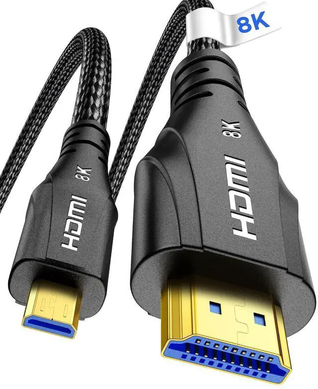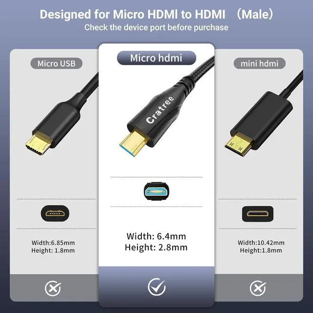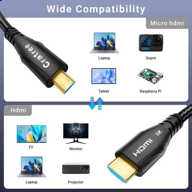 Cratree8k Micro HDMI to HDMI Cable 6.6FT supports 8K@60Hz, 4K@120Hz, 4K@144Hz Full HD resolution. It can help you to stream audio and video from a camera, tablet or laptop through the Micro HDMI Port to Your HDTV or projector with an HDMI port.
