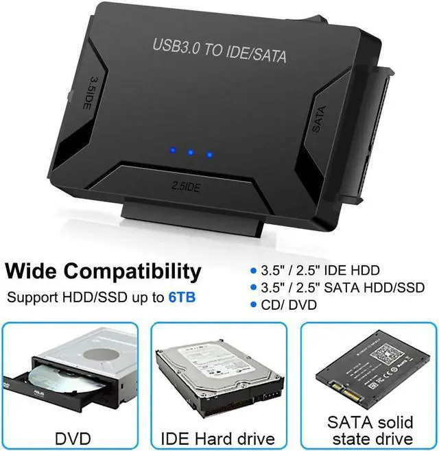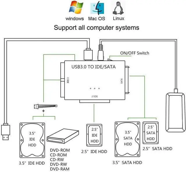 UNIVERSAL USB to SATA/ IDE ADAPTER -- Our USB to SATA IDE HDD adapter is designed for 2.5"/ 3.5" SATA HDD/ SDD, 2.5"/ 3.5" IDE HDD hard drive, supporting DVD-ROM, CD-ROM, CD-RW, DVD-RW, DVD+RW, compatible with windows 7,8,10, vista, XP; Mac OS,9,10; LINUSX.