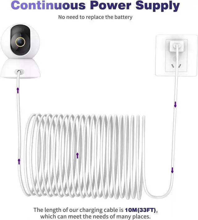 33FT/ 10M extra long enough to let you mount the CCTV camera wherever you like without having to often charge the batteries