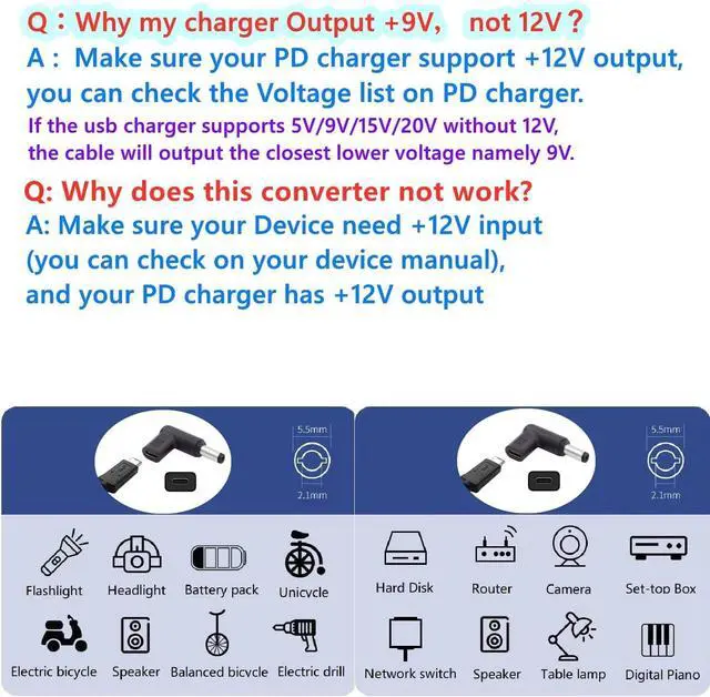 How to Use: To power equipment with a DC 5.5 x 2.1mm jack requiring 12V, connect this converter to a PD charger or PD power bank using a C-to-C cable. Note: This converter supports 12V only, not 20V, and is not suitable for laptops.