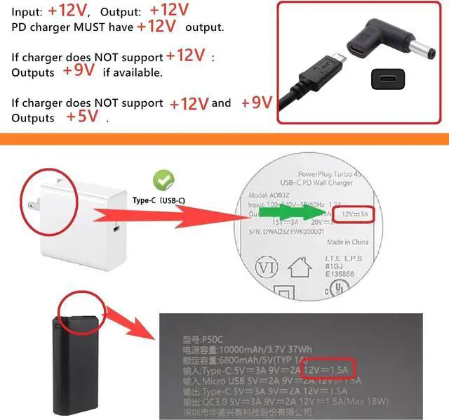 PD Power and C to C Cable Requirement: This Product is just a conversion device, you need to provide correct PD power Adapter or PD Power Bank which support 12V output and C to C Cable. Please note the Type-C charger power must be over than the output end power. The Power Bank should support 12V output. If the usb c charger supports 5V/9V/15V/20V without 12V, the Converter will output the closest lower voltage 9V. This Converter can't be used for charging laptop