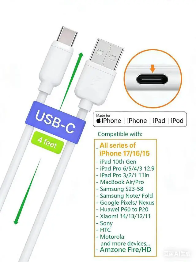 1pcs x 4-Feet USB - USB C Cable Supports up to 12W