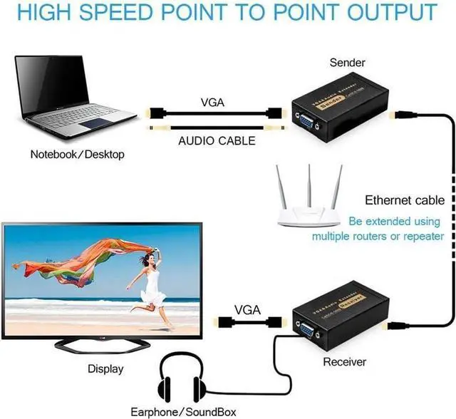 WIDELY USED This vga extender supports all operating systems, no installation program, plug and play. Support computers, monitors, projectors or televisions, hard disk video recorder, monitor host and other equipment with VGA interface. It can be widely used in KTV, multimedia video, network engineering, stage demo, outdoor display and so on.