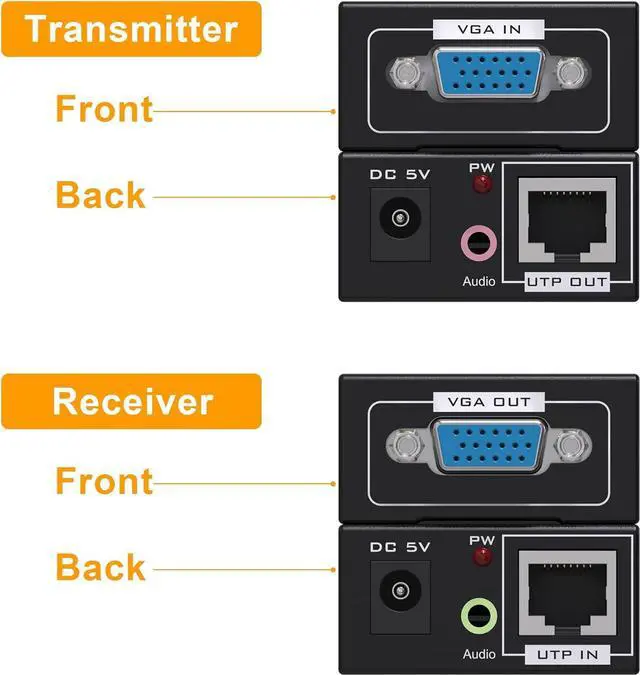 EASY TO USE AND ENVIRONMENTAL PROTECTION This VGA transmitter and receiver is easy to operate. Firstly, connect the Sender and signal source with one VGA(male to male) cable, and one DC3.5 audio cable. Secondly, connect the Receiver to the monitor and earphone with one VGA(male to male) cable. Lastly, connect the Sender and Receiver with one cat5e/6 cable, and power on the Sender and Receiver.
