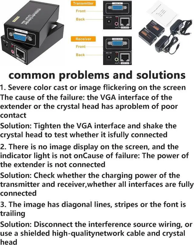 VGA OVER ETHERNET VGA Extender Using high quality galvanized alloy shell material, it is lightning-proof, dust-proof, anti-static, and ensure rapid cooling. Please make sure that the sender and receiver have been connected to the charging power, use a shielded Ethernet cable, and tighten the VGA cable interface, otherwise the screen may flicker.