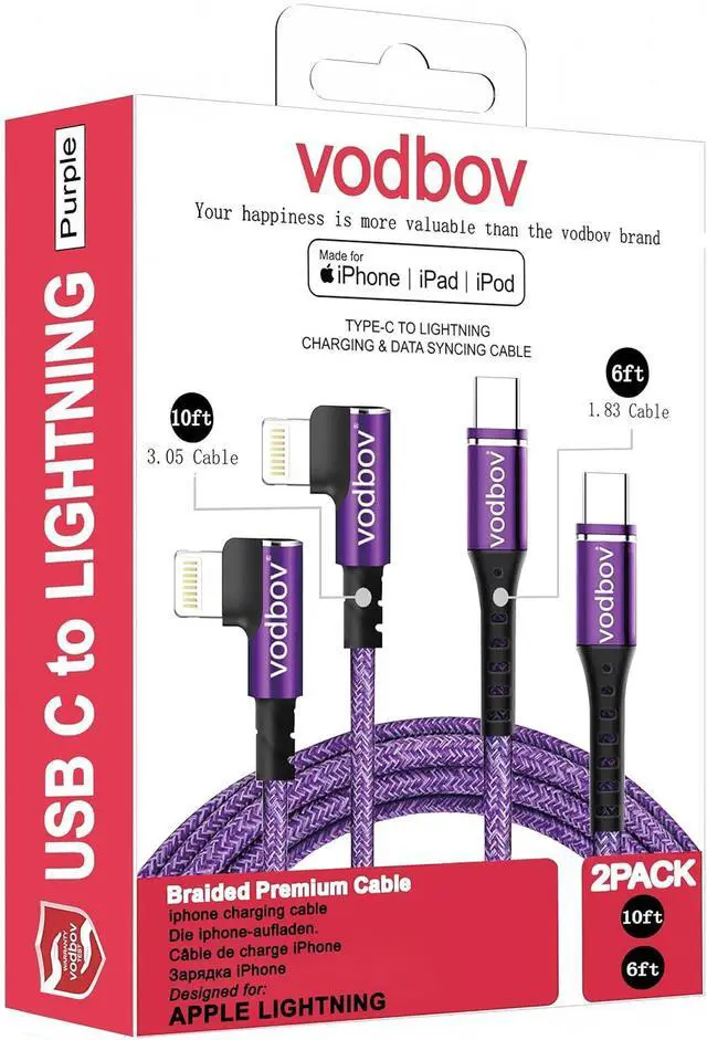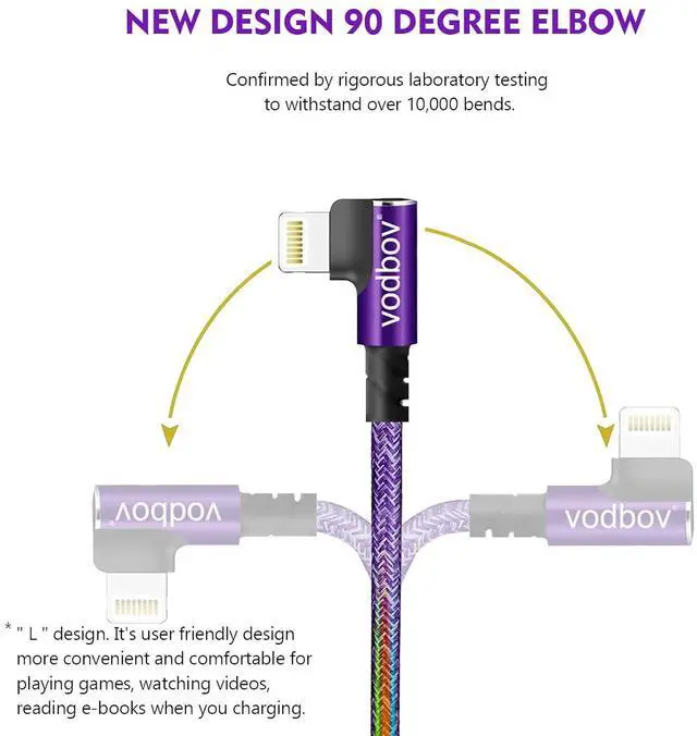 [ Superior Performance] The 90-degree right angle design at the phone plug makes it more convenient for you to play games, and its right sharp angle protects the plug and relieves the strain on the cable. The iphone charging cable adopts the anti-resistance aluminum alloy connector, our iphone charging cable has thickened copper wire inside, iphone lightning cable with Reinforced stress points ,vodbov iphone charger cord many times more durable than normal cable on the market.