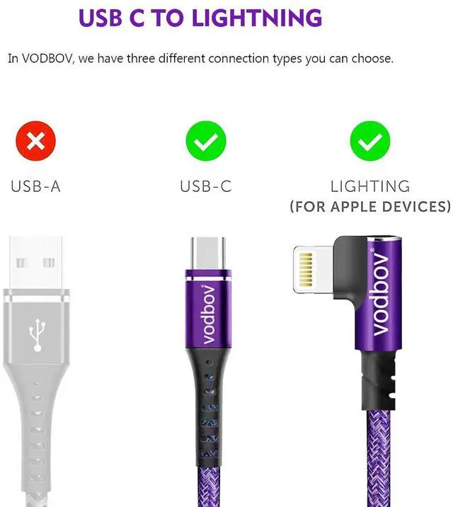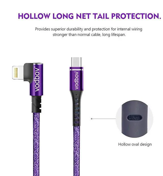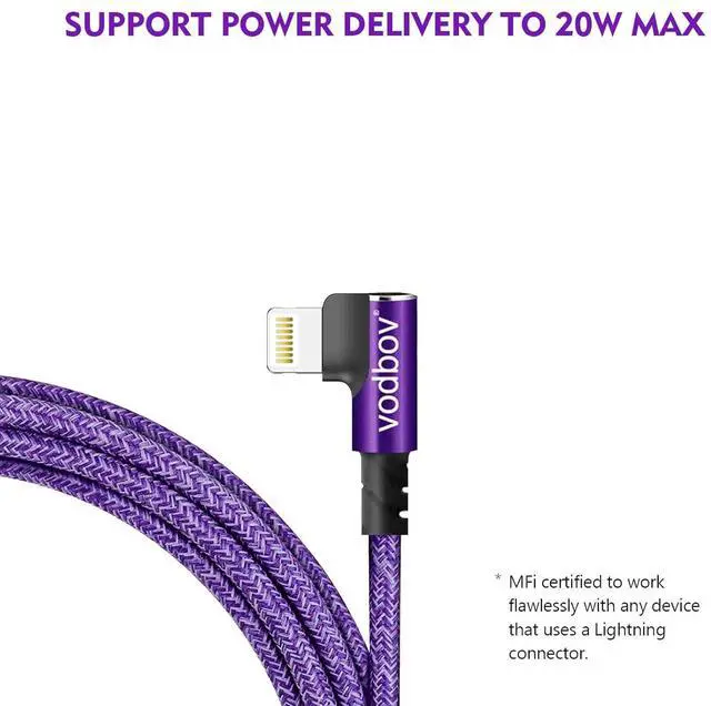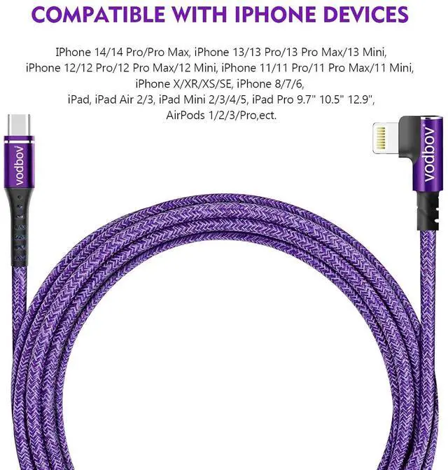 [MFi Certified & Safety Charging]VODBOV 90 degree USB C lightning cable Built-In MFi Certified Chipset ensures your device completely safe when charging, High-quality four-core copper wires enhance charging & data transfer speed of the iphone charging cables. and have completed MFi certification and strict quality testing,100% compatibility, stable data transfer, no error message for standard charging.